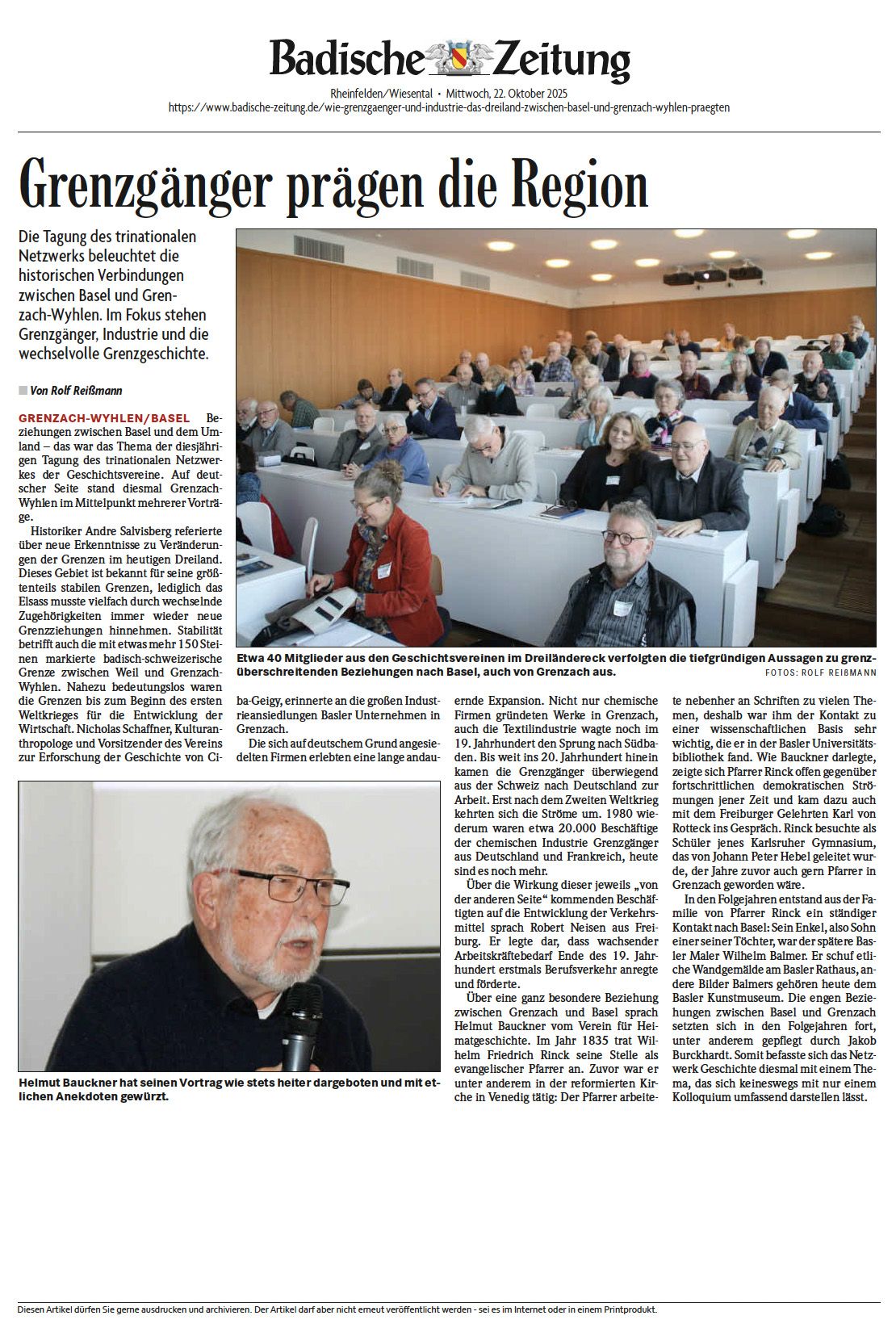 Die Badische Zeitung vom 22. Oktober 2025 berichtete über die trinationale Tagung des Netzwerks der Geschichtsvereine am Oberrhein
