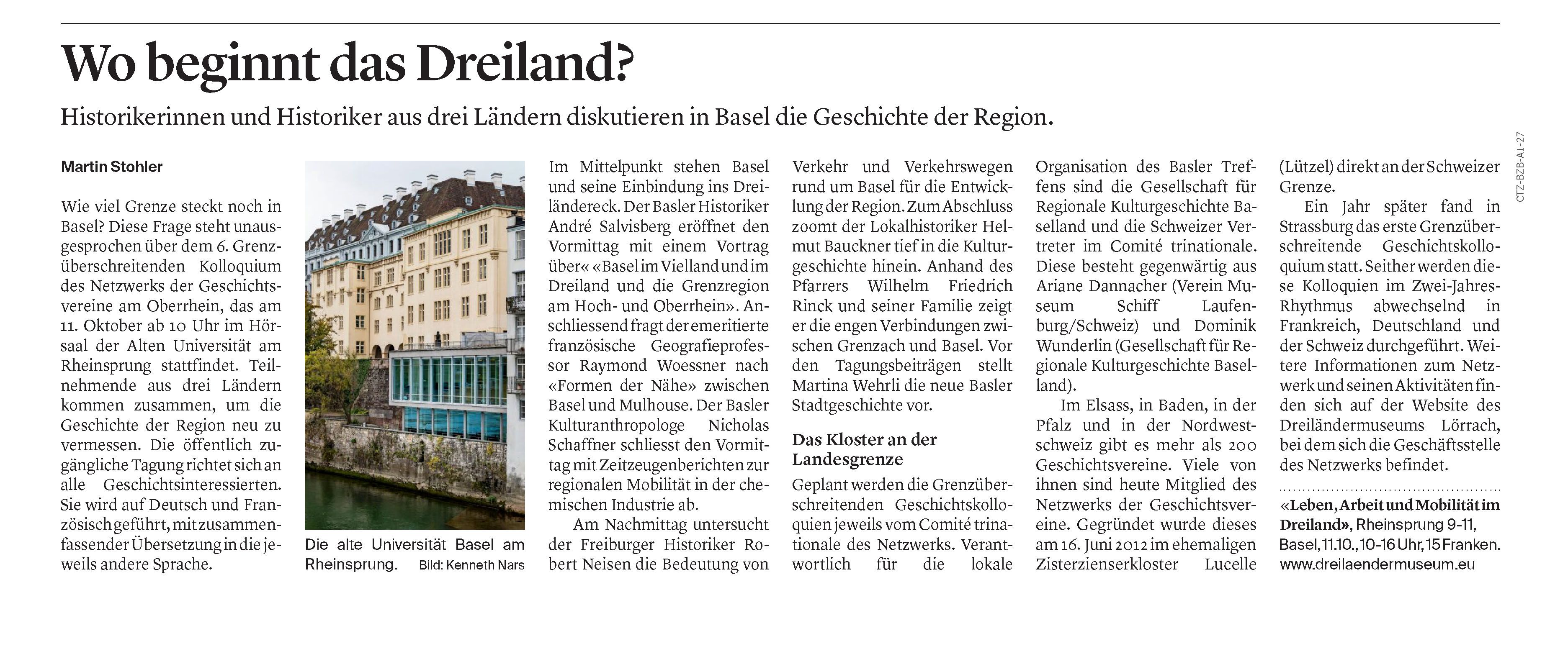 Die bz Basel vom 11. Oktober 2025 berichtete über das grenzüberschreitende Kolloquium des Netzwerks der Geschichtsvereine am Oberrhein